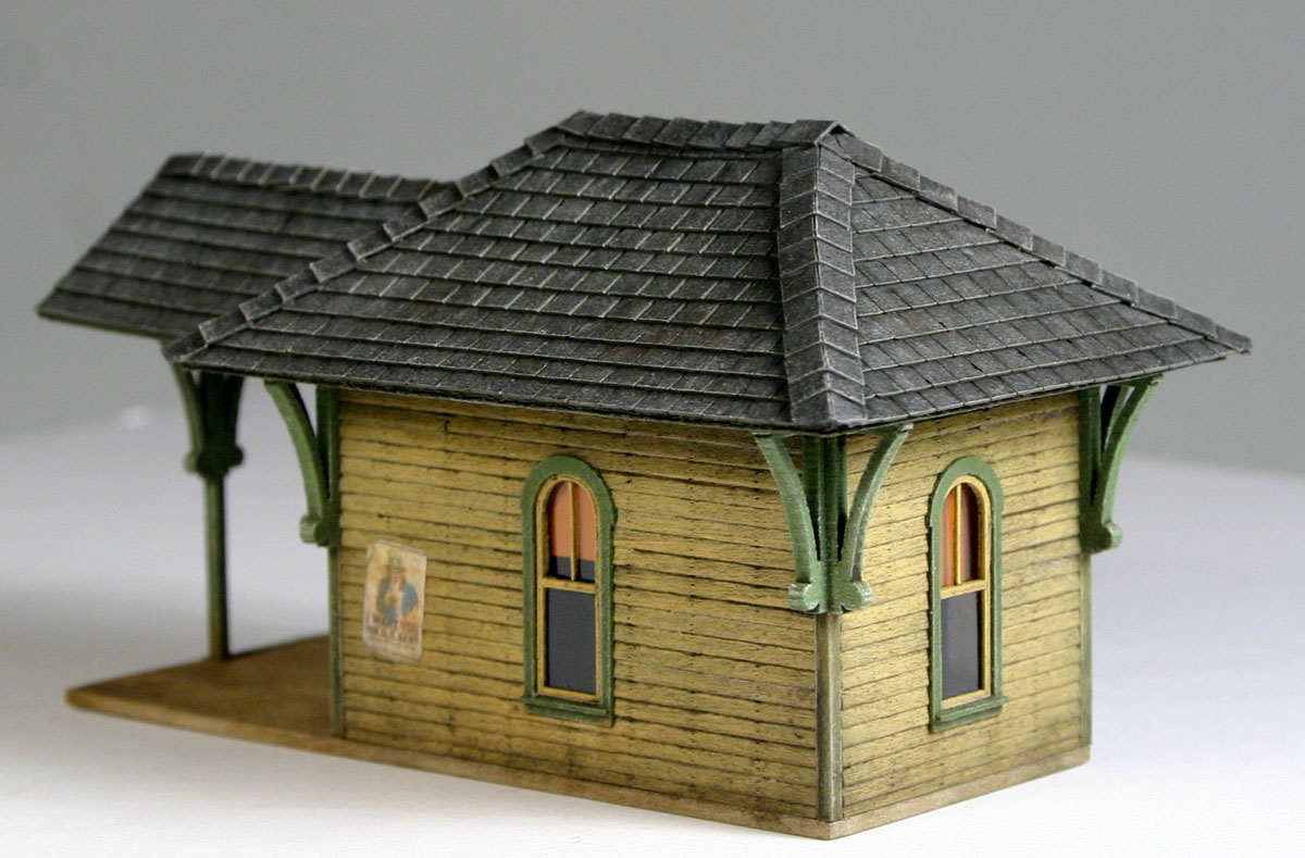 Buckley Station was one of the free FOS kits. I wanted to paint it using the same buff and red combo to match the other trackside structures I built recently, but the pilot model had the same painting scheme. I wanted something different. I didn't go very far though. I only changed the trim color to green. Also, the pilot had a tarpaper roof. No surprise there. It was free kit after all! To me the roof was lacking some character so I upgraded it with the Bar Mills asphalt shingles. I think it looks better that way.